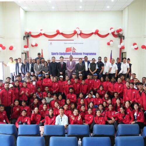 नेपालस्थित चिनियाँ दूतावासका डेपुटी चिफ दि मिसन वाङ झिनले राखेपका सदस्य–सचिव टङ्कलाल घिसिङलाई अन्तर्राष्ट्रिय खेलकुद परिसरमा मंगलबार आयोजित एक कार्यक्रमबीच करिब ८५ लाख बराबरका विभिन्न ३४ प्रकारका खेल सामग्री हस्तान्तरण गरेका थिए ।