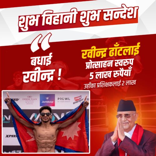 काठमाडौँ । आफ्ना भारतीय प्रतिद्वन्द्वीलाई हराउँदै म्याट्रिक्स फाइट नाइट (एमएफएन) बान्टमवेट च्याम्पियन बन्न सफल बझाङका रवीन्द्र ढाँटलाई प्रोत्साहनस्वरुप पाँच लाख प्रदान गरिने भएको छ ।