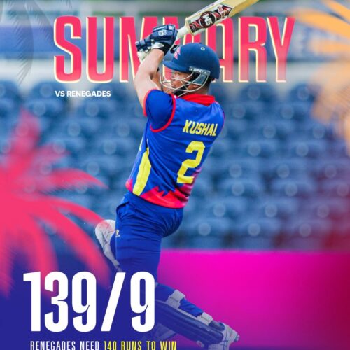 काठमाडौँ । अष्ट्रेलियाको नर्दन टेरिटोरीमा जारी टप एण्ड टी-२० सिरिजअन्तर्गत आफ्नो पाँचौँ खेलमा नेपालले मेलबर्न रेनेगेड्स एकेडेमीलाई जितका लागि एक सय ४० रनको लक्ष्य दिएको छ ।
