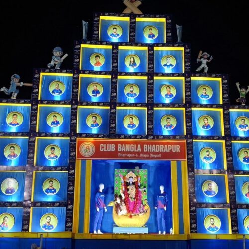 झापा । झापाको भद्रपुर–६ मा नेपाली राष्ट्रिय क्रिकेट खेलाडीहरूको तस्वीर राखेर आकर्षक कालीपूजा पण्डाल निर्माण गरिएको छ । ‘जेन–जी’ आन्दोलनपछि देशमा देखिएको राजनीतिक अस्थिरताबाट निराश जनतालाई भर्खरै राष्ट्रिय क्रिकेट टोलीले दिएको उत्साह र खुसीलाई आत्मसात् गर्दै क्लब बाङ्गला भद्रपुरले पण्डाल निर्माण गरेको पूजा समितिका संयोजक विजय साहले बताए ।