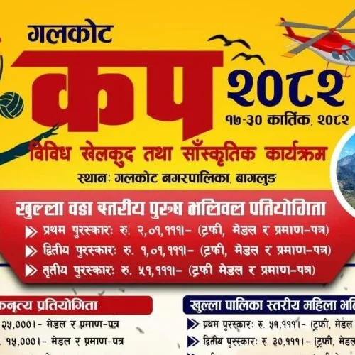 खुला वडास्तरीय पुरुष भलिबल, खुला पालिकास्तरीय महिला भलिबल, भेट्रान्स कप र माध्यमिक विद्यालयस्तरीय पुरुष भलिबल प्रतियोगिता आयोजना गर्न लागिएको गलकोट नगर भलिबल सङ्घका अध्यक्ष एवं कार्यक्रम संयोजक होमबहादुर थापाले जानकारी दिए ।