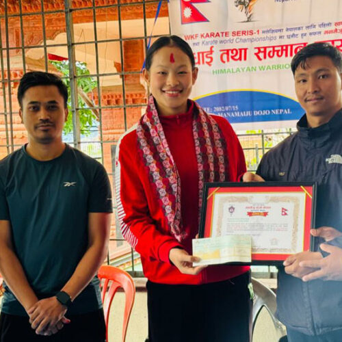 काठमाडौं। नेपाली राष्ट्रिय कराते खेलाडी एरिका गुरुङ शनिबार सम्मानित भएकी छिन्। क्यानाडामा बासोबास गर्दै आएका मनमैजु डोजोका प्रमुख प्रशिक्षक निरज महर्जनले उनलाई सम्मान गरेका हुन्।