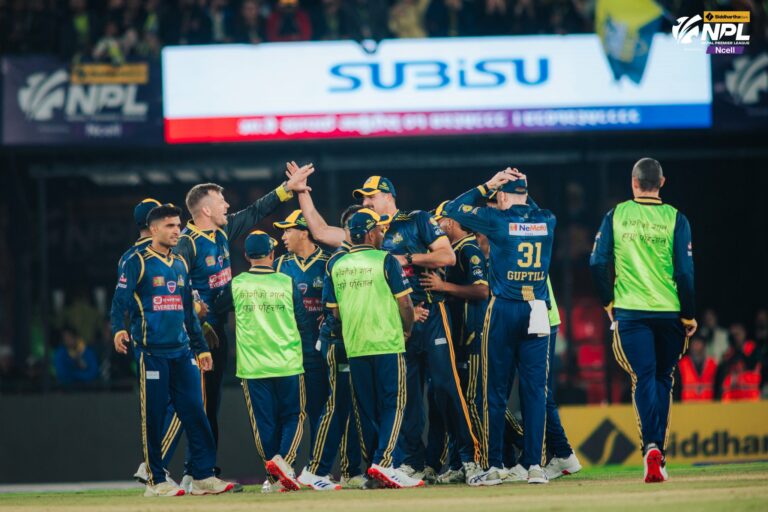 गुप्टिल र लोकेशले दोस्रो विकेटका लागि १३२ रनको साझेदारीसमेत गरे । यस्तै, शुभम रन्जनेले १६ बलमा ३८, बसिर अहमदले १३ बलमा १ चौका र १ छक्काको मद्दतमा २३ रन जोडे । बलिङतर्फ पोखराका मार्ट टेलरले २, आकाश चन्द, सागर ढकाल र कुशल भुर्तेलले १–१ विकेट लिए ।