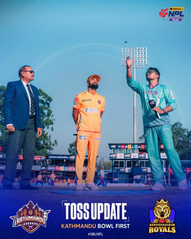 काठमाडौं । नेपाल प्रिमियर लिग (एनपीएल) मा काठमाण्डू गोर्खाजले सुदूरपश्चिम रोयल्सविरुद्ध पहिले बलिङ गर्ने भएको छ । त्रिवि क्रिकेट मैदानमा काठमाण्डूका कप्तान करण केसीले टस जितेर बलिङको निर्णय लिएका हुन् ।
