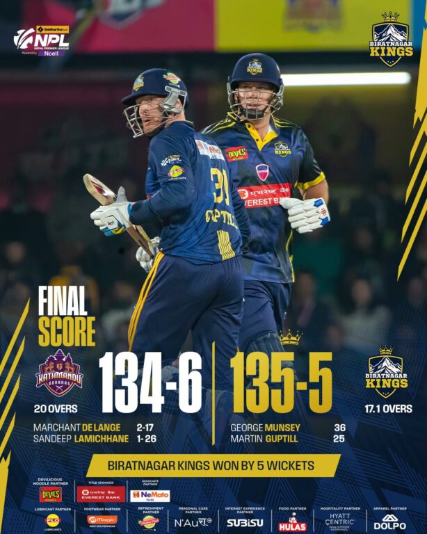 काठमान्डूले दिएको १३५ रनको लक्ष्य पछ्याएको विराटनगरले १७.१ ओभरमा ५ विकेट गुमाएर १३५ रन बनाउँदै लक्ष्य पूरा गर्यो । विराटनगरको जितमा जर्ज मुन्सेले १६ बलमा ५ चौका र २ छक्काको सहयोगमा सर्वाधिक ३६ रन बनाए।