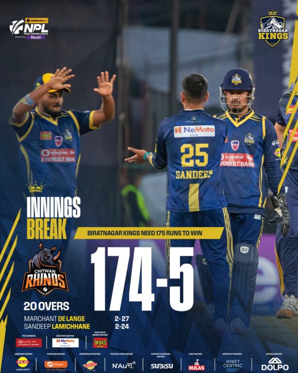 काठमाडौँ । नेपाल प्रिमियर लिग (एनपिएल)मा आजको खेलमा चितवन राइनोजले विराटनगर किङ्ग्सलाई १७५ रनको लक्ष्य दिएको छ ।