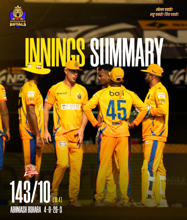 काठमाडौं । नेपाल प्रिमियर लिग (एनपीएल) मा लुम्बिनी लायन्सले सुदूरपश्चिम रोयल्सलाई १४४ रनको लक्ष्य प्रस्तुत गरेको छ ।