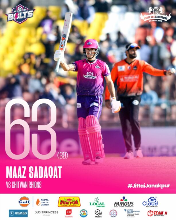 काठमाडौँ । जनकपुर बोल्ट्सका माज सदाकत नेपाल प्रिमियर लिग (एनपिएल) मा अर्धशतक बनाउने २०औँ खेलाडी बनेका छन् । उनले आज चितवन राइनोजकाविरुद्ध २४ बल खेल्दै तीन छक्का र पाँच चौकाको मद्दतमा अर्धशतक बनाएका हुन् ।