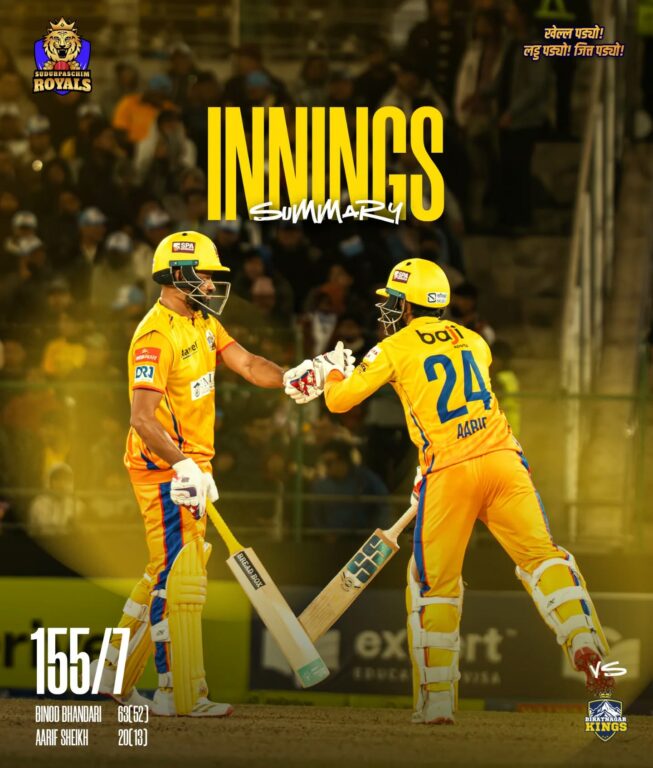 काठमाडौँ । नेपाल प्रिमियर लिग (एनपीएल) मा सुदूरपश्चिम रोयल्सले विराटनगर किङ्ग्सलाई १५६ रनको लक्ष्य दिएको छ । त्रिवि क्रिकेट मैदानमा टस हारेर ब्याटिङ गरेको सुदूरपश्चिमले २० ओभरमा ७ विकेट गुमाएर १५५ रन बनायो । सुदूरपश्चिमका विनोद भण्डारीले ६३, आरिफ शेख र शेल्डन ज्याक्सनले समान २० रन बनाए ।