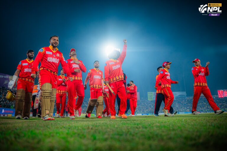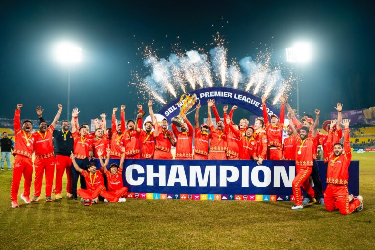 उपविजेता सुदूरपश्चिमले ५१ लाखमा चित्त बुझायो । उपाधि जितेपछि ट्रफीका साथ लुम्बिनी लायन्सका खेलाडी।