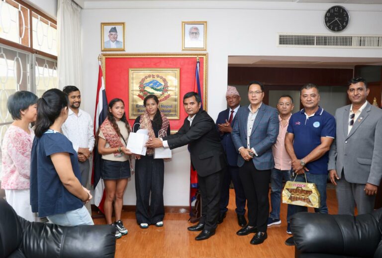 काठमाडौँ। थाइल्याण्डको प्रसिद्ध पर्यटकीय तथा साहसिक खेलकुद गन्तव्य च्याङ्गमाईमा गत साता आयोजित विश्वप्रसिद्ध अन्तरराष्ट्रिय ट्रेल रन प्रतियोगितामा उल्लेखनीय सफलता हासिल गरेका नेपाली धावकद्वय सनमाया बुढा र रनमाया बुढालाई नेपाली राजदूतावास बैङ्ककले सम्मान गरेको छ ।