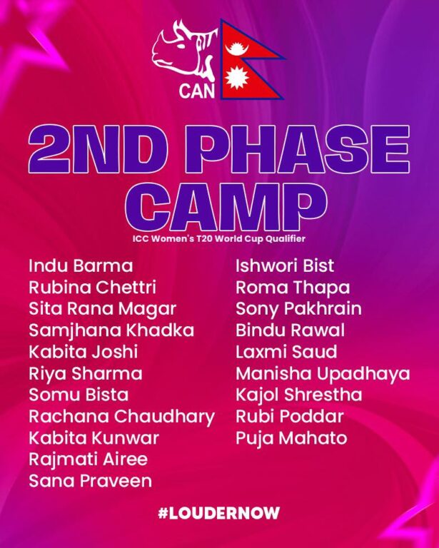 नेपाल क्रिकेट संघ (क्यान)ले दोस्रो चरणको बन्द प्रशिक्षणका लागि २० खेलाडी छनोट गरेको हो । बन्द प्रशिक्षणका लागि छनोट भएका खेलाडीमा इन्दु बर्मा, राजमती ऐरी, सम्झना खड्का, कविता जोशी, रिया शर्मा, सोमु विष्ट, रचनाकुमारी चौधरी, रुवी पोदार, पूजा महतो, कविता कुँवर, रुविना क्षेत्री, सना प्रवीण, ईश्वर विष्ट, रोमा थापा, सोनी पाख्रिन, विन्दु रावल, लक्ष्मी सावद, मनिषा उपाध्याय, सीता राना मगर र काजोल श्रेष्ठ रहेका छन् ।