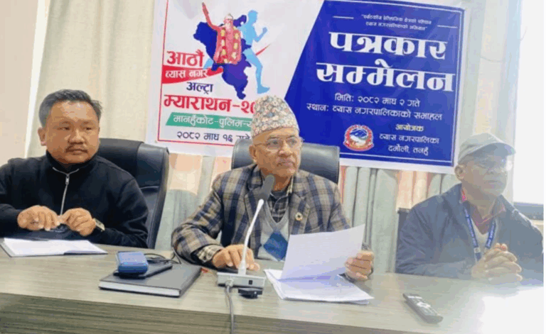 डुम्रे (तनहुँ) । तनहुँको व्यास नगरपालिकाले ‘पर्यटन, धार्मिक एवं ऐतिहासिक क्षेत्रको पहिचानः व्यास नगरपालिकाको अभियान’ नारासहित आगामी माघ १६ गते सहिद दिवसका अवसरमा ‘आठौँ व्यास नगर अल्ट्रा म्याराथन’ आयोजना गर्ने भएको छ ।