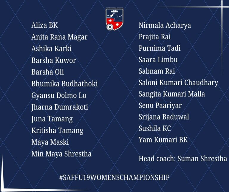 काठमाडौँ । अखिल नेपाल फुटबल सङ्घ (एन्फा)ले पोखरामा हुने साफ यू–१९ महिला च्याम्पियनसिपका लागि मंगवबार २३ सदस्यीय नेपाली  टोली घोषणा गरेको छ ।