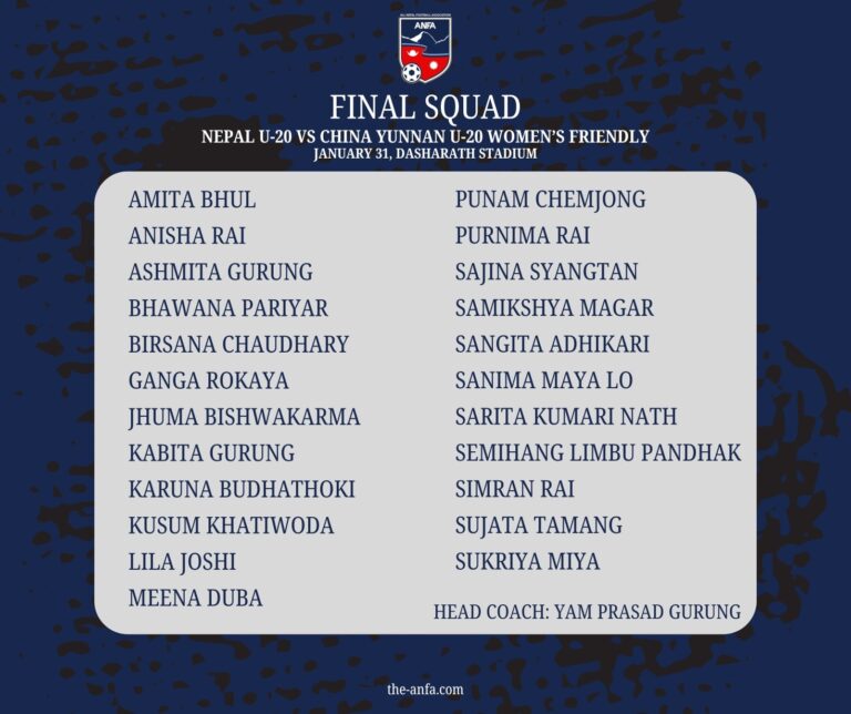काठमाडौं । अखिल नेपाल फुटबल सङ्घ (एन्फा) ले चीनको युनान प्रान्तीय युवा टोलीविरुद्ध मैत्रीपूर्ण खेलका लागि आज २३ सदस्यीय नेपाली राष्ट्रिय यु–२० महिला टोली घोषणा गरेको छ ।