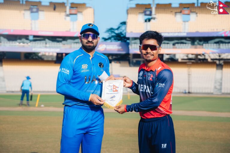 काठमाडौं । आईसीसी टी–२० विश्वकपअन्तर्गत आज हुने आफ्नो पहिलो अभ्यास खेलमा नेपालले युएईविरुद्ध टस जितेको छ । चेन्नईस्थित एमए चिदाबराम स्टेडियममा हुने खेलमा नेपालका कप्तान रोहित पौडेलले टस जितेर युएईलाई ब्याटिङको निम्तो दिएका हुन् ।