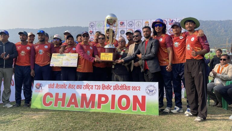 नवलपुर । नवलपुरको गैँडाकोटमा सम्पन्न पाँचौं गैँडाकोट मेयर कप राष्ट्रिय टी–ट्वान्टी क्रिकेट प्रतियोगिताको उपाधि लुम्बिनी प्रदेशले जितेको छ । मंगलबार भएको फाइनलमा मधेस प्रदेशलाई नौ विकेटले हराउँदै लुम्बिनी प्रदेशले उपाधि हात पारेको हो ।
