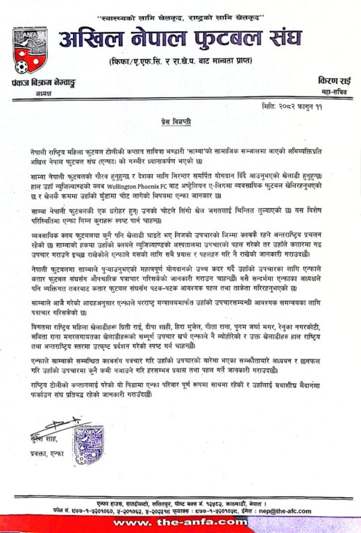 साथै साम्बाको आग्रहअनुसार परराष्ट्र मन्त्रालयमार्फत उपचारसम्बन्धी कूटनीतिक समन्वयका लागि पनि पत्राचार गरिएको एन्फाले स्पष्ट पारेको छ ।