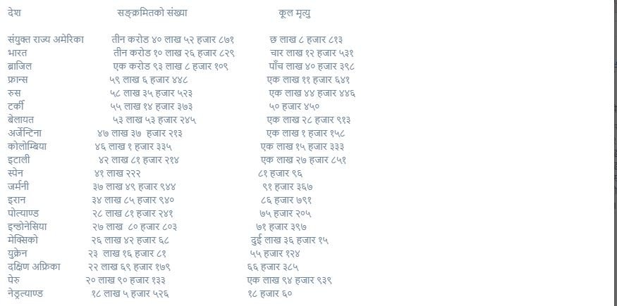 कोरोना शुरु भएयता हालसम्म विश्वभर यस सङ्क्रमणबाट ज्यान गुमाउनेको संख्या ४० लाख ७४ हजार नाघेको छ । जोन्स हप्किन्स विश्वविद्यालयले दिएको पछिल्लो विवरणअनुसार विश्वभरमा ४० लाख ७४ हजार ६८० जनाको मृत्यु भएको छ ।