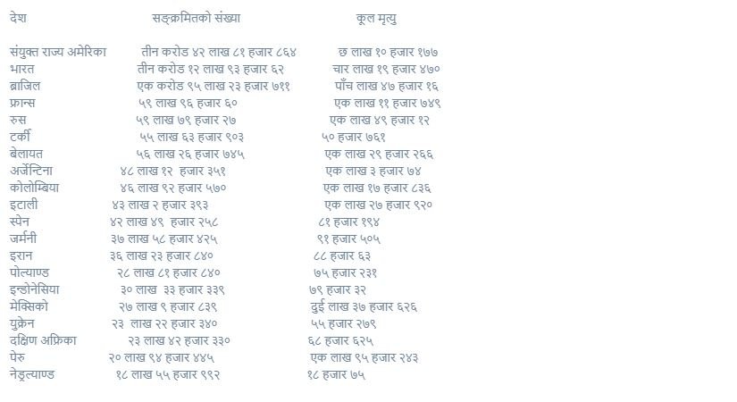 कोरोना शुरु भएयता हालसम्म विश्वभर यस सङ्क्रमणबाट ज्यान गुमाउनेको संख्या ४१ लाख ३५ हजार नाघेको छ । जोन्स हप्किन्स विश्वविद्यालयले दिएको पछिल्लो विवरणअनुसार विश्वभरमा ४१ लाख ३५ हजार ८१० जनाको मृत्यु भएको छ ।