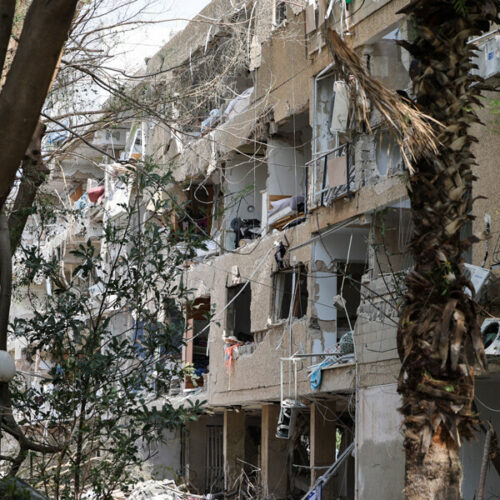 बिहान ७ः३० बजे (०४३० जिएमटी) इजरायलमा मिसाइलको दुई लहरका मिसाइल प्रहार भएपछिसार्वजनिक प्रसारणकर्ता क्यान ११ ले मध्य इजरायलमा रहेको भग्नावशेषको ढिस्कोले घेरिएको भवनको तस्बिर देखाएको छ।