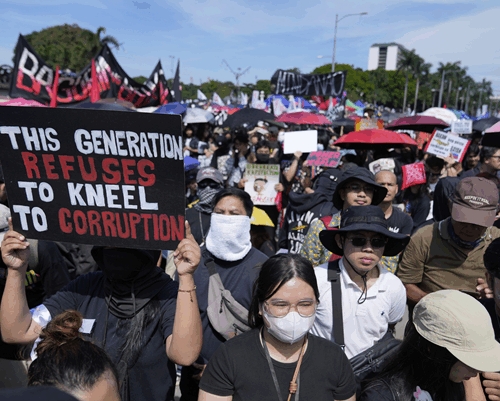 प्रदर्शनकारीहरूले फिलिपिन्सको झण्डा बोके र ‘अब छैन, धेरै, तिनीहरूलाई जेलमा हाल’ भन्ने नारासहितका ब्यानर देखाउँदै दोषीहरूलाई तत्काल कारबाही गर्न माग गरेका छन् ।