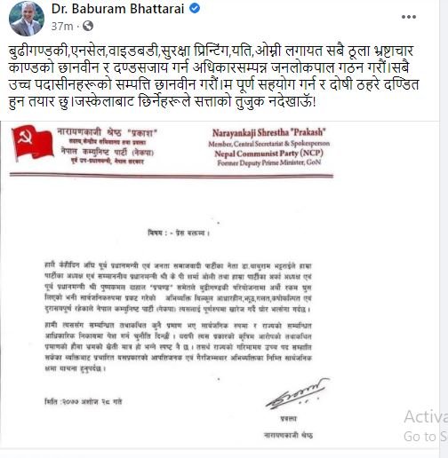 भट्टराईले ट्वीटरमा लेखेका छन्, ‘बूढीगण्डकी, एनसेल,वाइडबडी,सुरक्षा प्रिन्टिंग,यति,ओम्नी लगायत सबै ठूला भ्रष्टाचार काण्डको छानविन र दण्डसजाय गर्न अधिकारसम्पन्न जनलोकपाल गठन गरौं । सबै उच्च पदासीनहरूको सम्पत्ति छानविन गरौं । म पूर्ण सहयोग गर्न र दोषी ठहरे दण्डित हुन तयार छु । जस्केलाबाट छिर्नेहरूले सत्ताको तुजुक नदेखाऊ !’